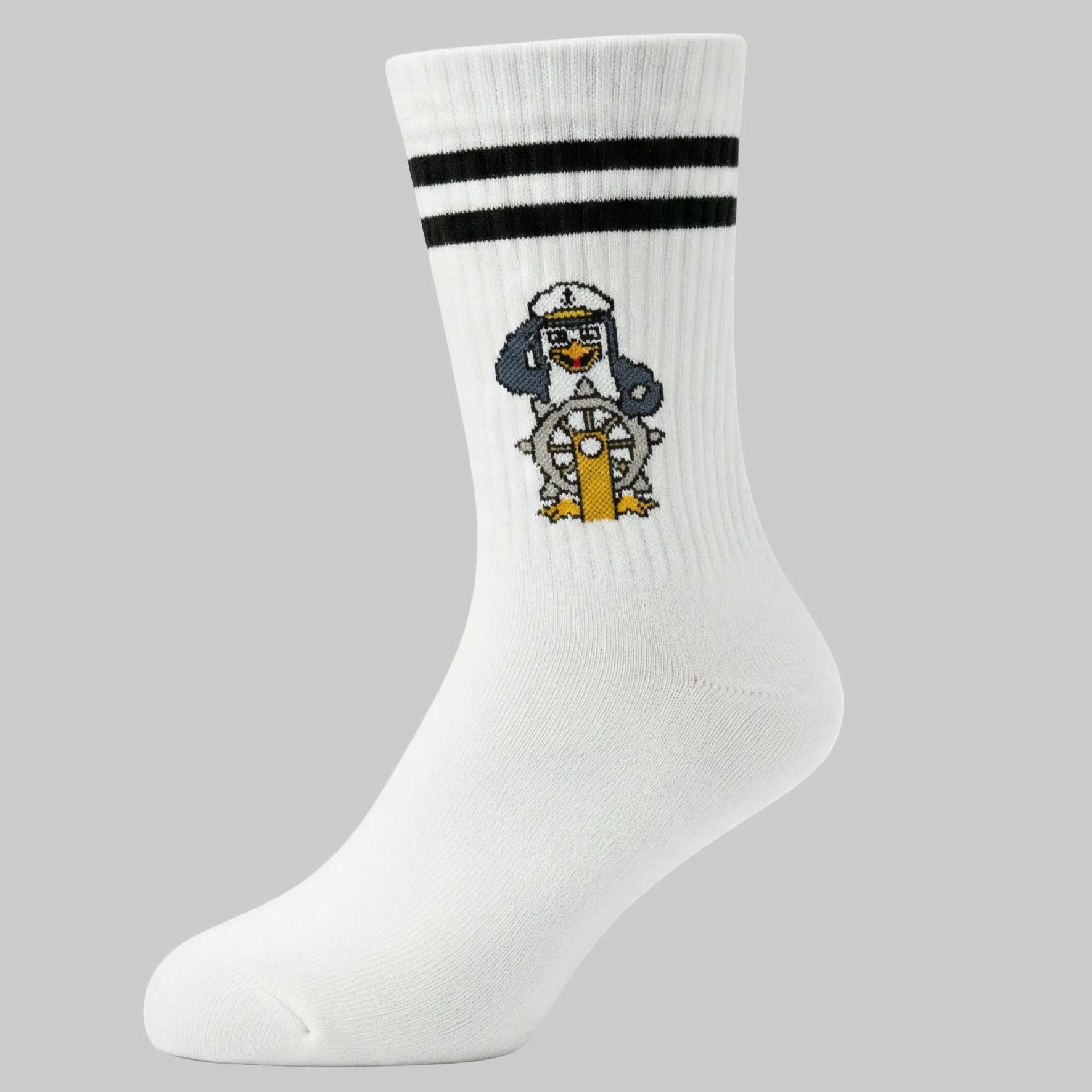 El calcetín "The Captain" es el toque perfecto para tu look casual, moderno y único. Con un elegante pingüino convertido en capitán de barco, este calcetín te invita a navegar con confianza y diversión, mientras mantienes un estilo impecable. Ya sea para un día relajado o para darle un giro original a tu atuendo diario, este diseño te llevará a nuevas aventuras de moda y confort.