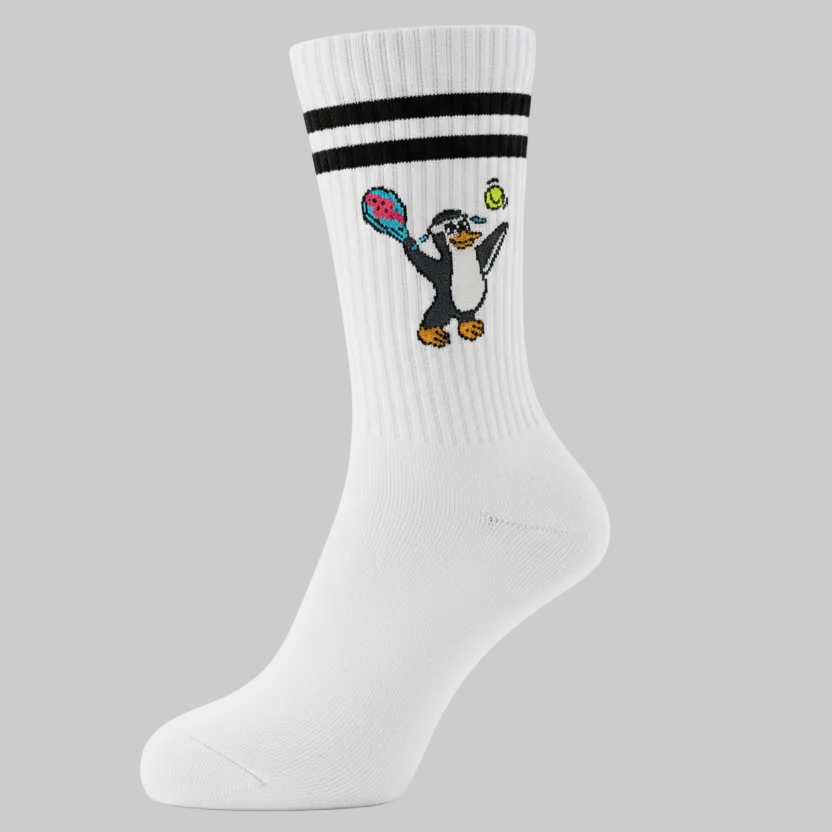 Ya sea para tus partidos de pádel, para un entrenamiento dinámico o para tu look casual con un toque original. ¡¿Quién viste unos calcetines con un pingüino que juega a pádel por la calle?!